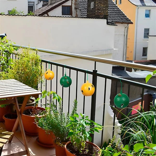 This hanging fly trap uses an adhesive surface to capture flies and other insects upon contact. It uses an adhesive surface to attract and trap flies and other insects. The structure supports use in gardens, patios, balconies, orchards, and greenhouses.
