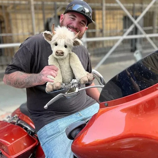 This Highland cow plush, named Hamish, is assembled individually. It is constructed primarily from alpaca fur. The toy is adorned with floral decorations and features winter-white coloring.