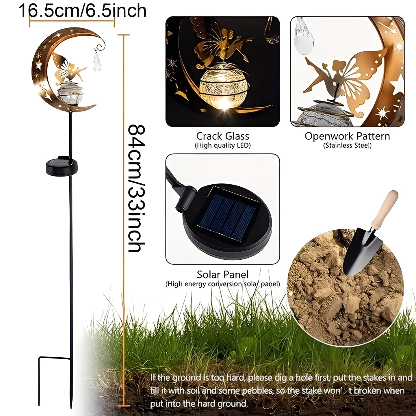 This outdoor light is intended to add decorative illumination to garden areas, pathways, or yards. The design features a fairy figure sitting on a crescent moon, which may help create a visual accent in outdoor spaces after dark. The decorative effect may vary depending on placement and surrounding light.