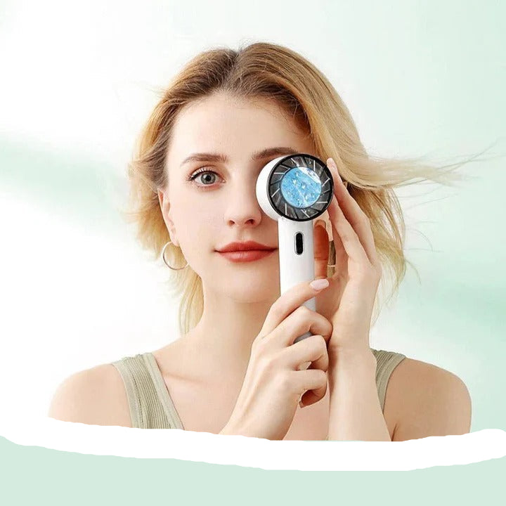 This portable fan is a compact device for circulating air in different areas, such as a home, office, or for light outdoor use. It is powered by a built-in rechargeable battery, allowing it to be used cordlessly.