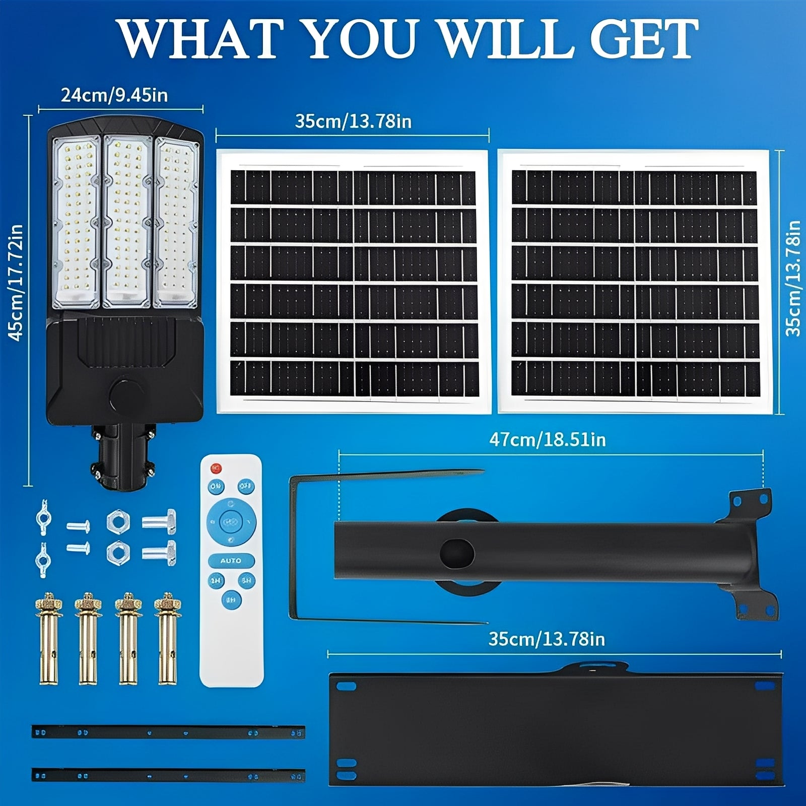 This solar-powered LED flood light is designed to provide outdoor illumination using energy collected from sunlight. It features dual solar panels intended to support battery charging during daylight hours. Light output is designed to illuminate outdoor areas such as driveways, gardens, or yards, though brightness and operating time may vary depending on environmental conditions and installation location.
