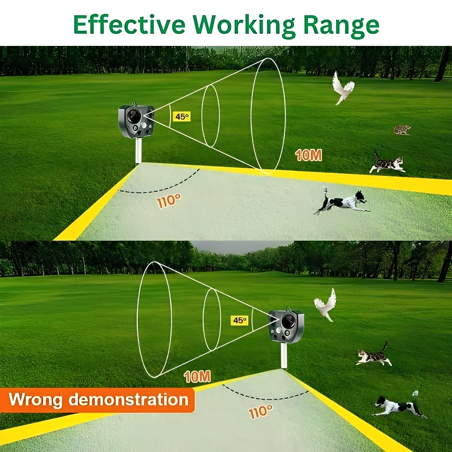 This device is equipped with a PIR motion sensor designed to detect movement within its sensing range. When motion is detected, it activates ultrasonic sound output along with flashing LED lights. This response is intended to help discourage animals from remaining in the monitored area. The sensor covers a wide angle and may detect movement at distances of up to 30 feet.
