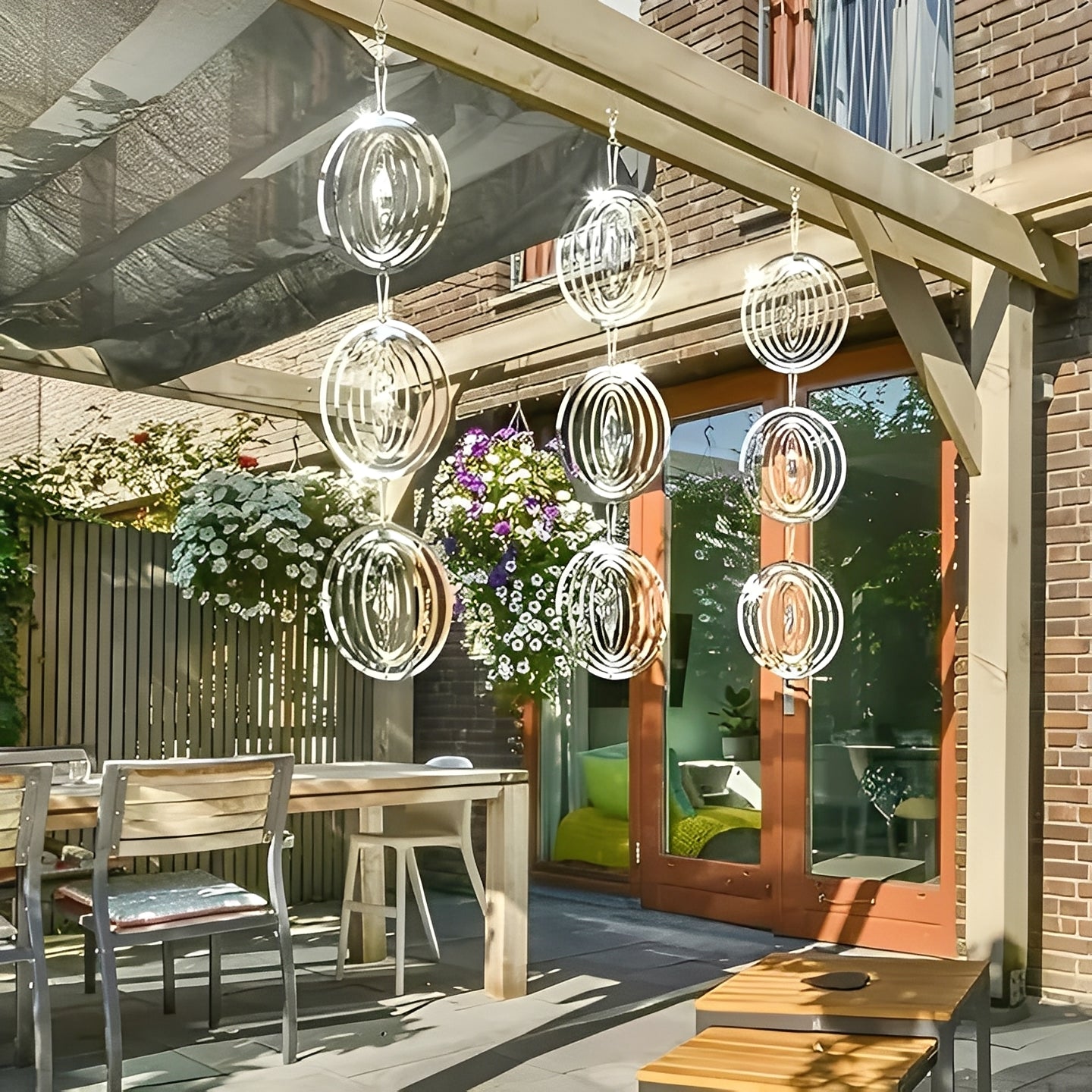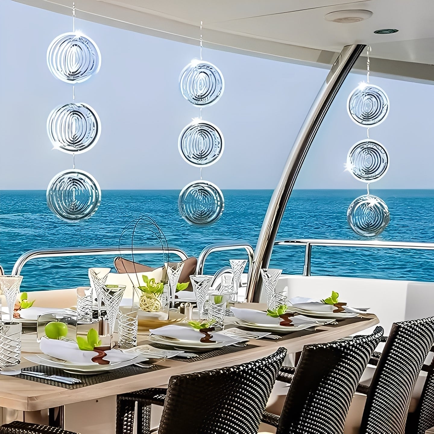 This hanging device features reflective stainless steel surfaces intended to create light flashes when the sun hits it. The structure may rotate in the presence of a breeze, and this combination of movement and reflections may help discourage birds from approaching certain areas, though effectiveness may vary depending on environment and bird behavior.